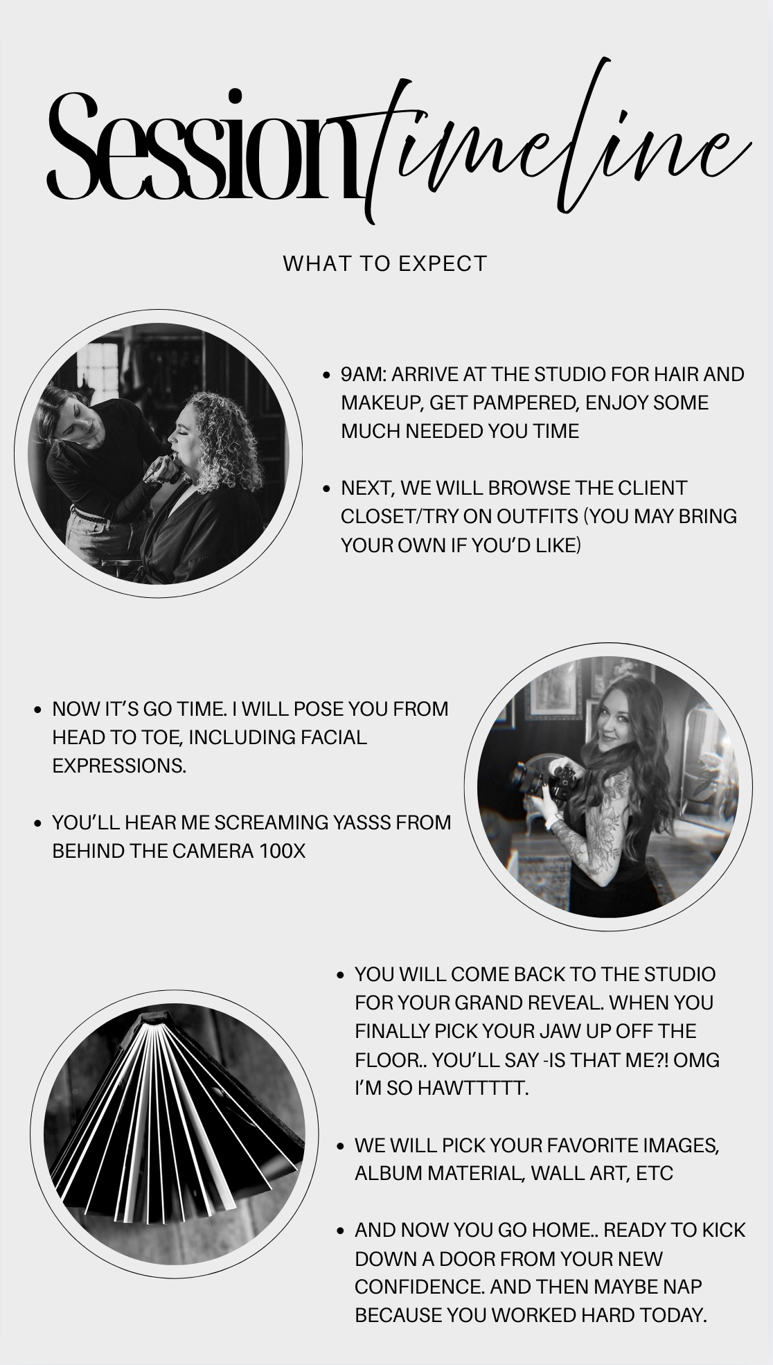 How long is the process? Sessions usually 2.5 hours (including approx. one hour for hair and makeup). After we finish, I'll send you off for lunch and you'll return in one hour for your reveal and order session. We usually finish up by 3:00pm. Now get excited, because you will be holding your amazing images within eight weeks or less.
